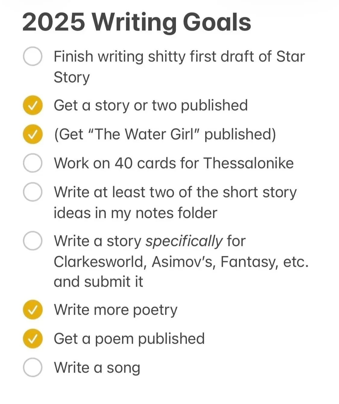 2025 Writing Goals in my Notes app