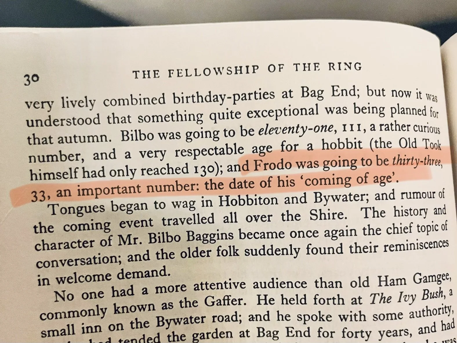 Recently, I started rereading my favorite trilogy, The Lord of the Rings. In chapter one, we learn how old Frodo is at the start of this story we’re all reading: “Frodo was going to be thirty-three, 33, an important number: the date of his ‘coming of age’.”